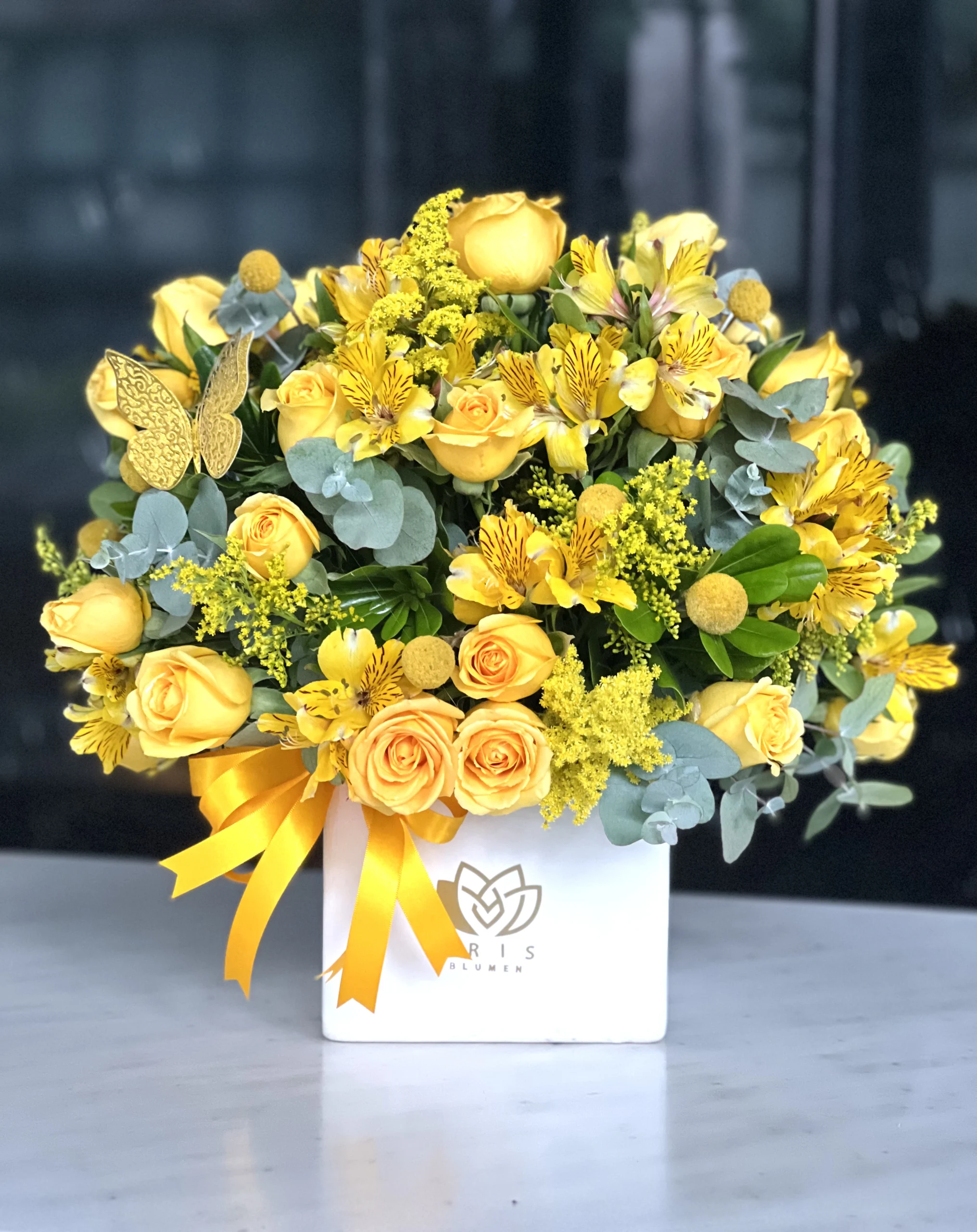 12 rosas amarillas, craspedia, alstroemeria, solidago, calvo japonés varigado, en una base cuadrada de cerámica blanca, y decorada con un moño de satín amarillo.