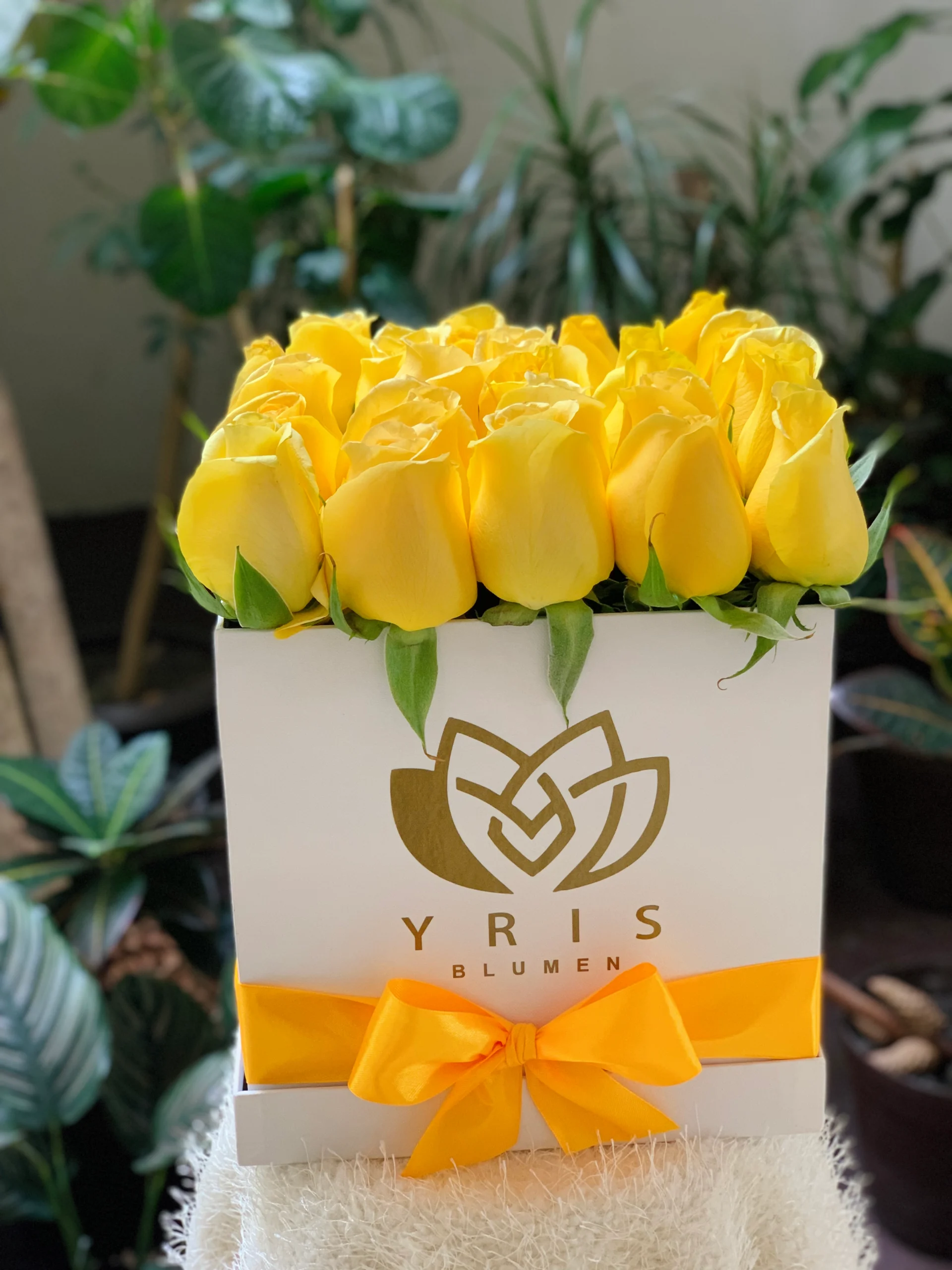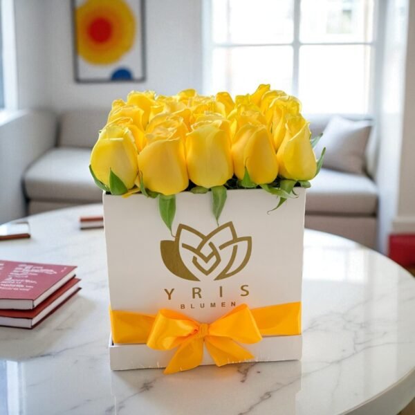 25 rosas amarillas calidad premium en caja negra elaborada artesanalmente con moño color Amarillo.