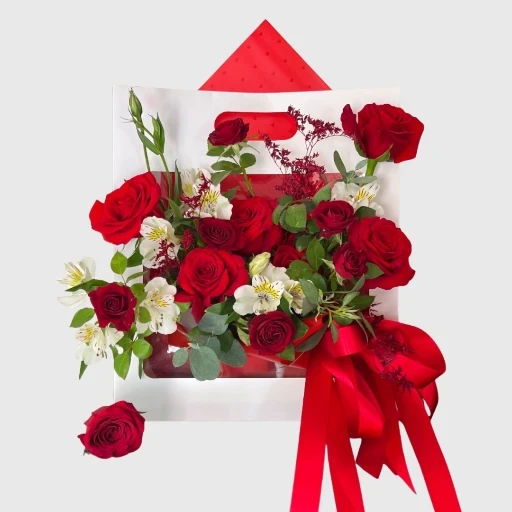 6 rosas rojas, Astromelias, mini rosa roja, Caspia deshidratada roja, eucalipto en una caja blanca tipo sobre de cartón y decorado con un moño rojo. Dimensiones: 35cm x 35 cm