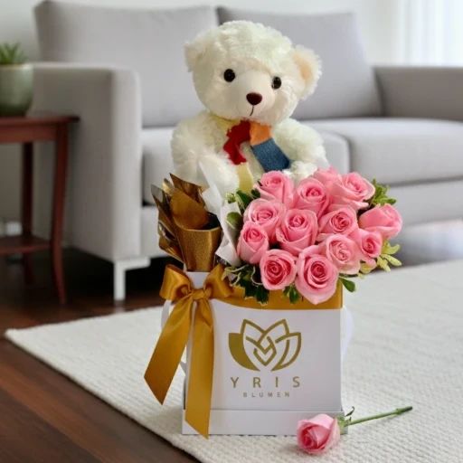 Bouquet de 12 rosas rosas calidad premium, un oso de peluche de 22 cm color blanco en una caja cuadrada elaborada artesanalmente y decorado con motivos dorados.