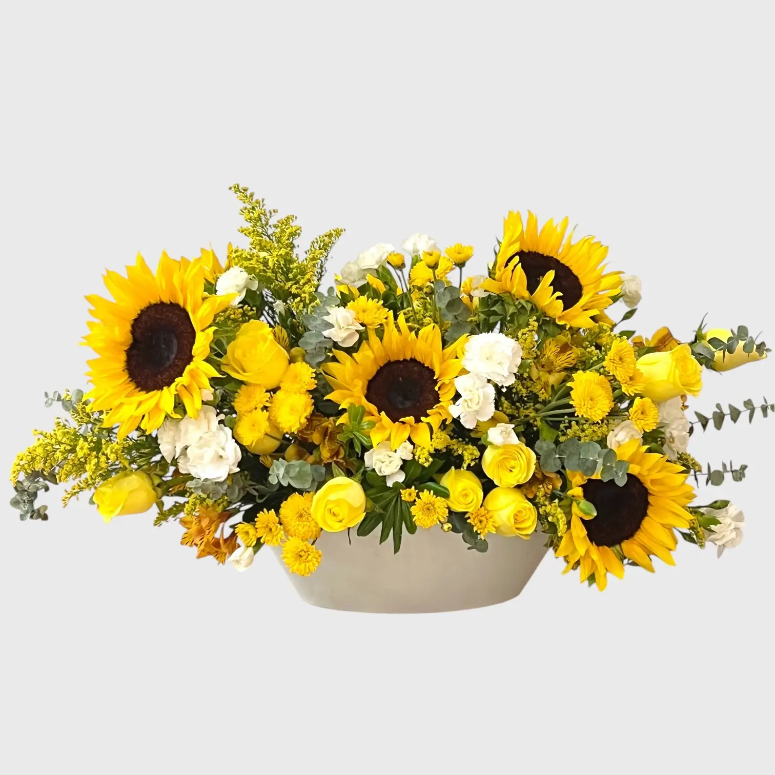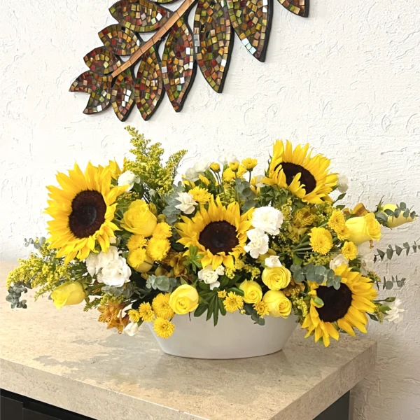 12 rosas amarillas, 5 girasoles, holandesa amarilla, clavelina blanca, solidago, astromelia amarilla y variedad de follaje en una base de cerámica blanca en forma de canoa.