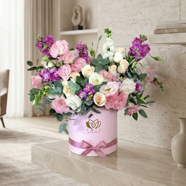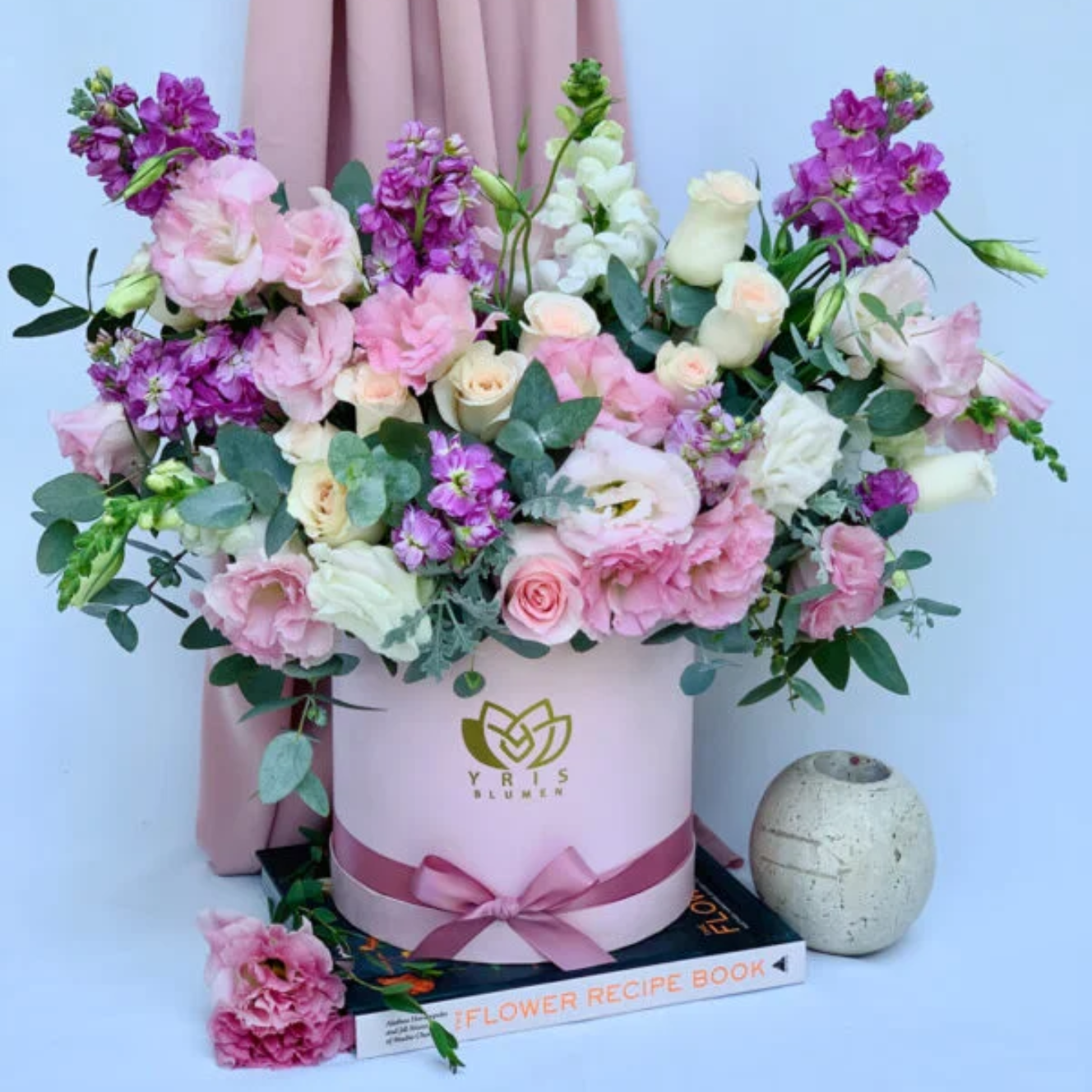 Lisiantus :24 rosas señorita, matiola, dragones, eucalipto y dustin miller, en una linda caja de cartón elaborada artesanalmente y adornada con un delicado moño rosa.