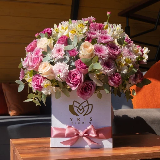 12 rosas lilas, 12 rosas rosas claro, complementadas con statices blancos, morelianas, astromelias y variedad de eucalipto en una caja elaborada artesanalmente.